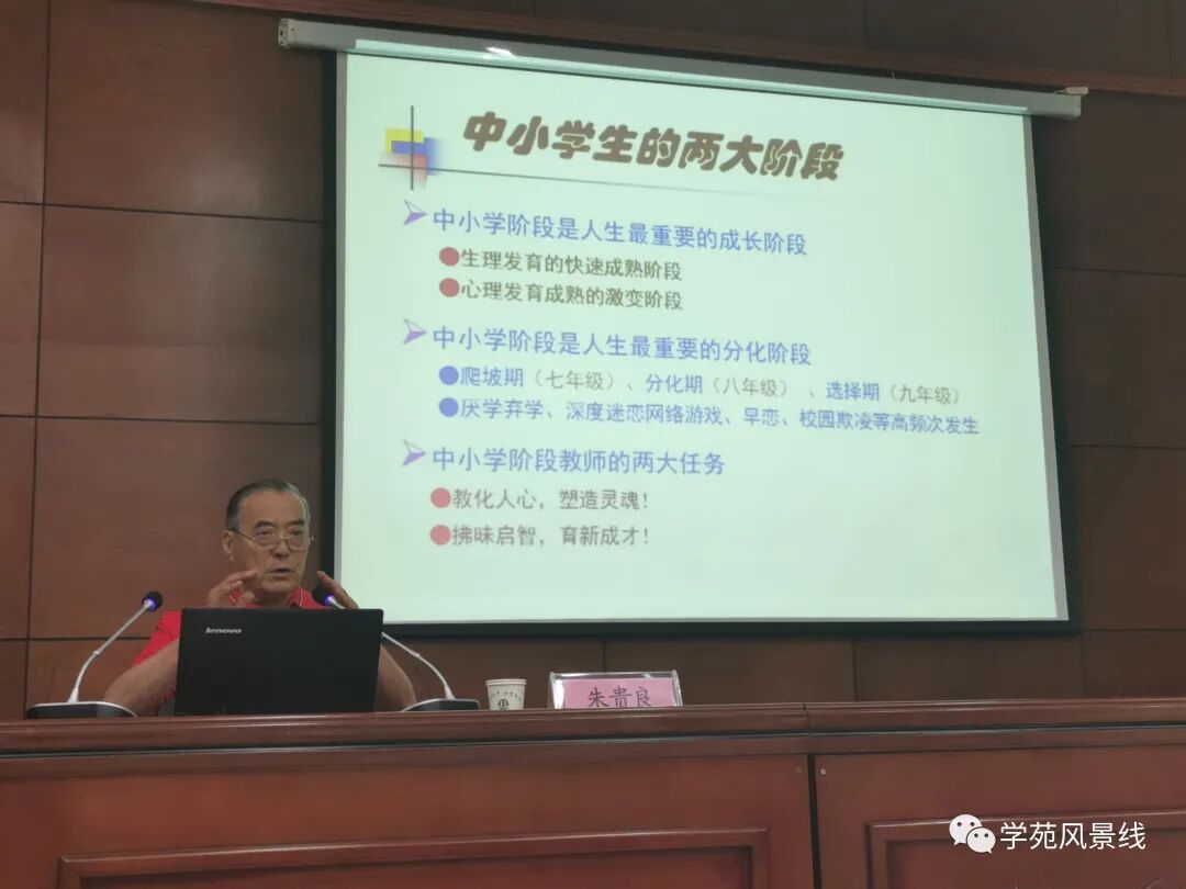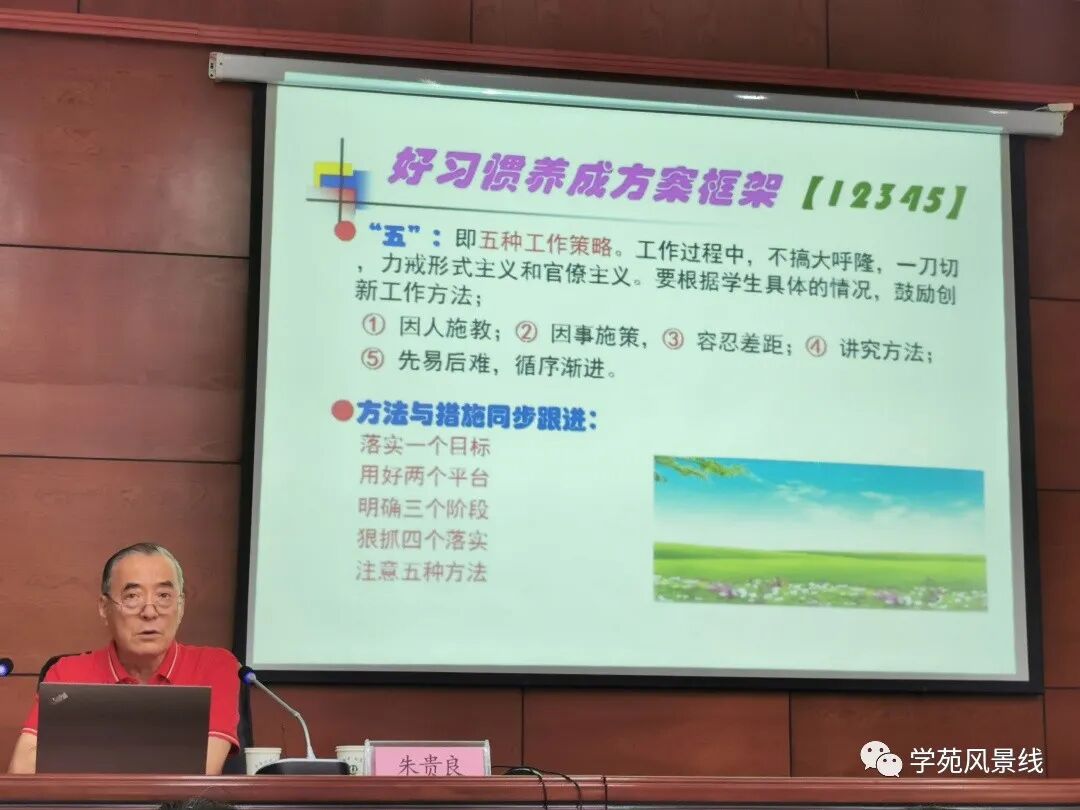 为增加建议的可操作性,朱教授系统性地提出了好习惯养成方案的“12345框架”,也就是落实一个目标,用好两个平台,明确三个阶段,狠抓四个落实,注意因人施教;因事施策;容忍差距;讲究方法;先易后难,循序渐进这五种方法。其次,他总结了培养好习惯需要解决的七个问题, 包括(1)加强学习,端正态度;(2)明确目标;(3)指导思想明确;(4)组织保证有力;(5)坚持家校共建方向,用好家长委员会、班级微信群两个平台;(6)主题教育突出,细节落实具体;(7)方法得当,措施完善,操作可行,跟进同步。讲座最后,朱教授再次深情地说到, “中国的未来在教育!少年强则国家强!好习惯是一种培根教育,是成长成才的前提。他衷心期待各位老师仰望星空、俯首细微,大力推进家教校共建,率先示范,把学子们带到诗和远方!”朱教授的讲话收获了热烈的掌声。
