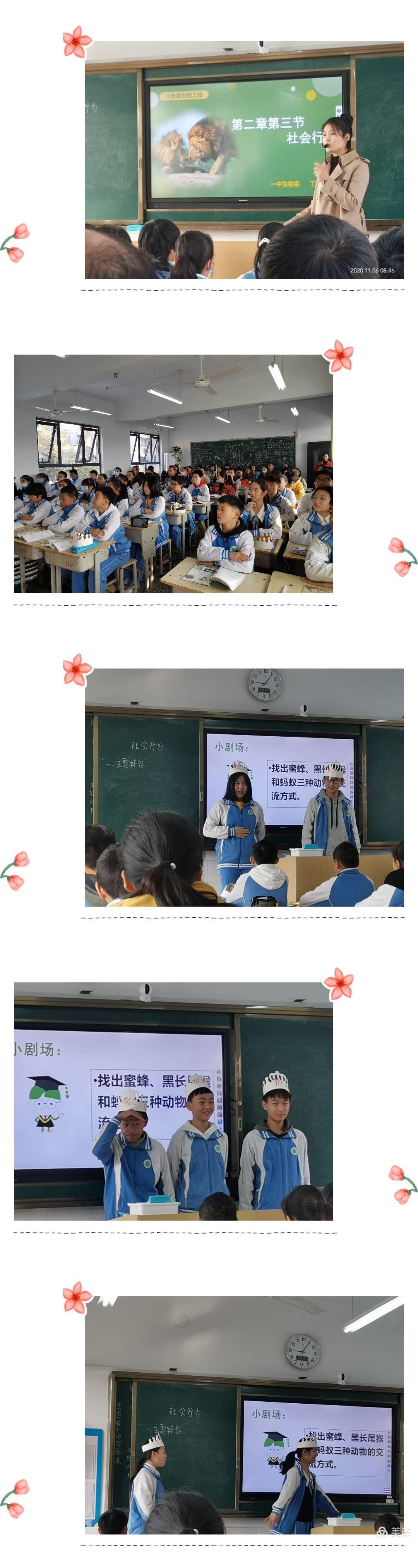 第一环节首先由丁菁文老师讲解了八年级上册第二章第三节的社会行为。丁老师通过让学生观看视频自学、小组讨论,角色扮演等形式引导学生轻松的学会了本节课,取得了很好的效果!