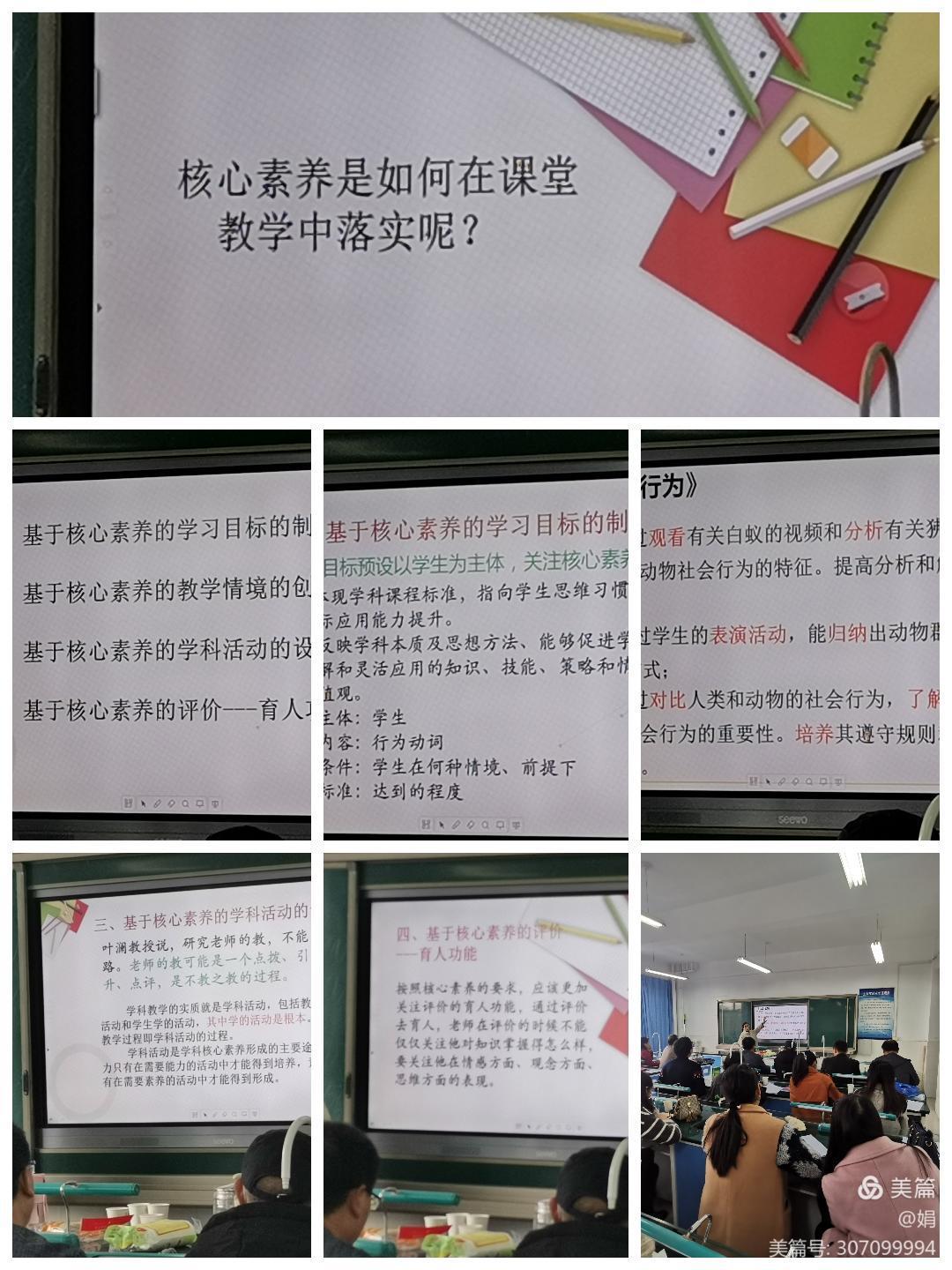 然后丁老师针对核心素养如何在课堂中落实给予以解读。具体在学习目标的制定,教学情境的创设,学科活动的设计,以及评价育人等方面给予了深度分析。