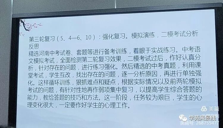 邓庄的司爱英老师在会议中也分享了邓庄中学中招语文复习计划。邓庄中学计划到2021年2月28号之前完成九年级下册教学内容。3月1号开始陆续进行一二三轮复习,考前两周进行第四轮冲刺复习,通过多次的模拟演练,帮助学生查漏补缺,为中招考试做好充分的准备。