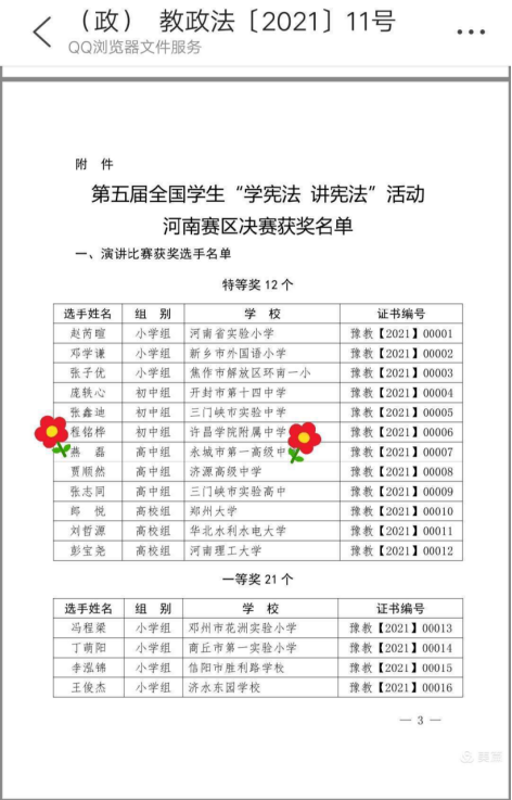 附中学子展英姿,捷报传来贺佳绩!许昌学院附属中学九八班程铭桦同学在李曼老师的精心辅导下,作为许昌市中学生组代表参加了河南赛区“学宪法、讲宪法”演讲比赛,最终经过几番激烈角逐,突出重围,荣获特等奖,成为河南省三名特等奖获得者之一,李曼老师荣获河南省优秀辅导老师,为许昌市赢得了荣誉!