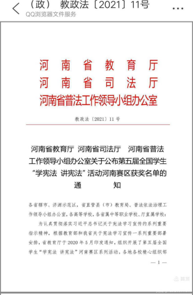 此次比赛时间长,规模大。比赛一共分为三个阶段,第一个阶段,由各地市举办演讲比赛,并选拔出优秀选手。在许昌市“学宪法,讲宪法”的演讲比赛中,程铭桦同学以全市第二名的好成绩脱颖而出,并得到了评委老师的一致认可。