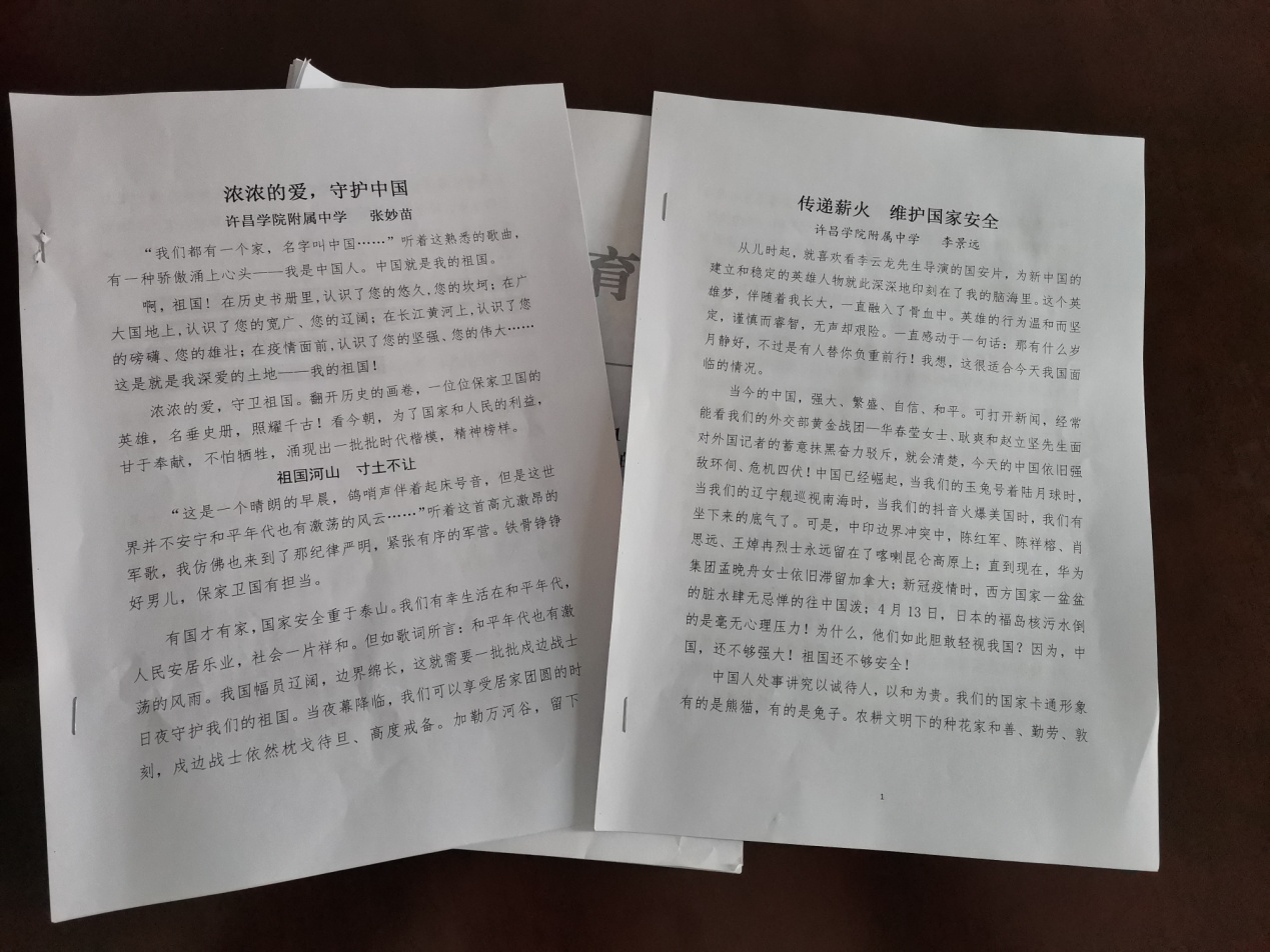 四、 开展了主题为“我和新时代国家安全”征文和演讲,老师和学生以身边人、身边事,以真挚的情感、独特的视角反映了本人学习贯彻国家安全观的深刻体会,讲述了对国家安全事业蓬勃发展的真实感受。