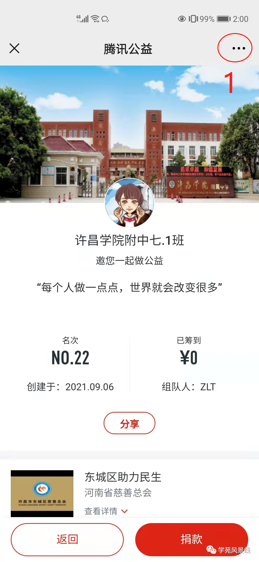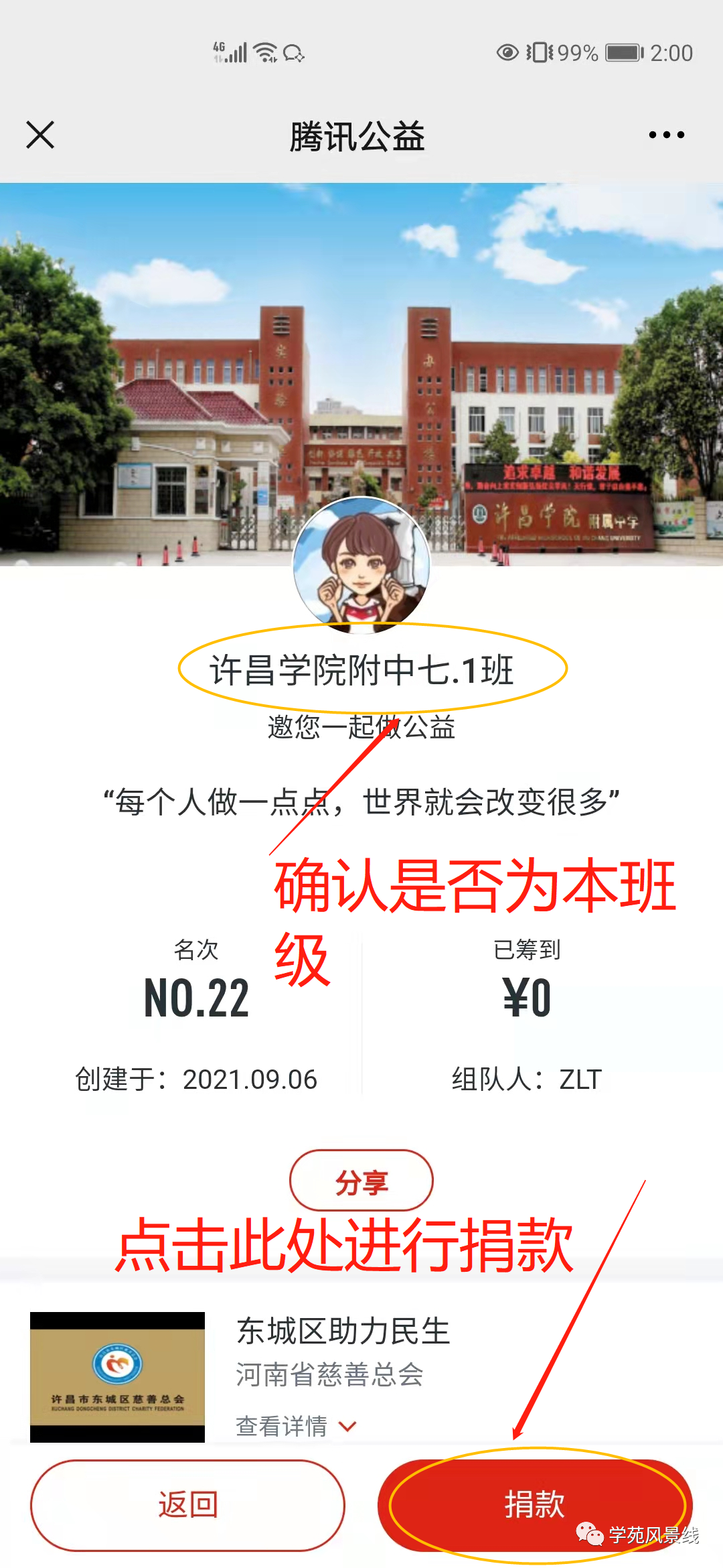 1.每个班级组成一个小队进行捐款,班主任将本班级捐款微信链接转发给学生家长,家长点击链接即可参加活动。