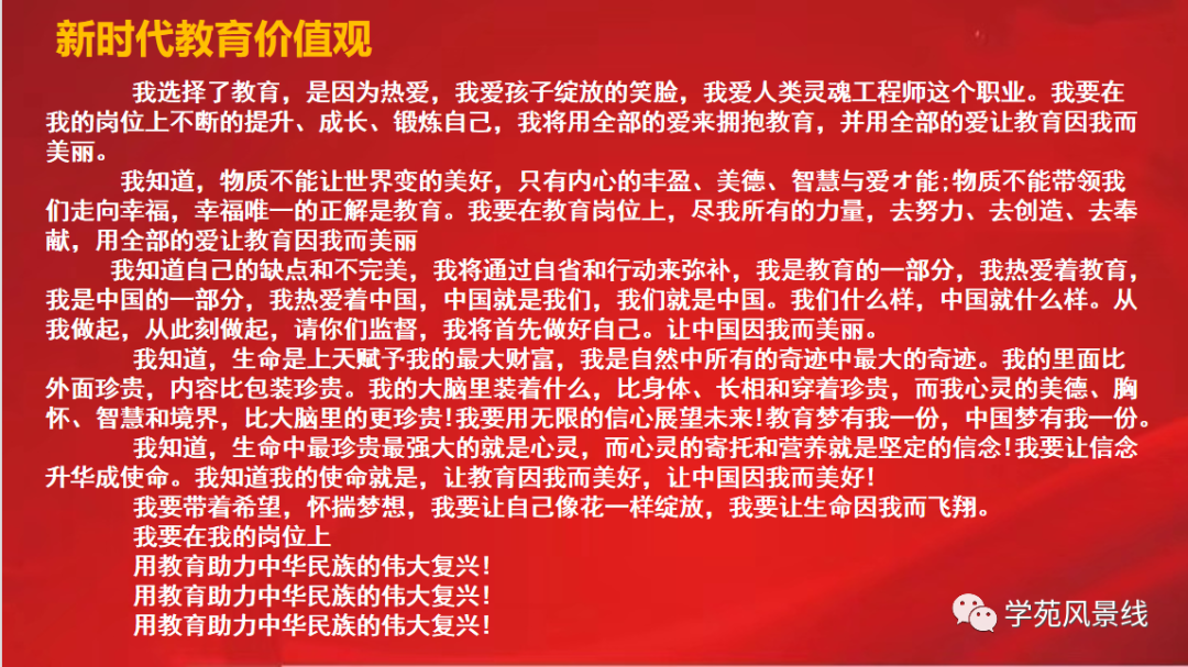 最后,鲁会平副校长带领全体教师宣誓“新时代教育价值观”,在一句句铿锵有力的誓词中,不仅增强了教师们的责任感和使命感,还激发了教师们的工作热情,附中全体教职工将以更好的精神风貌投身于教育事业,用全部的爱拥抱教育,在自己平凡的岗位上,用教育助力中华民族伟大复兴!