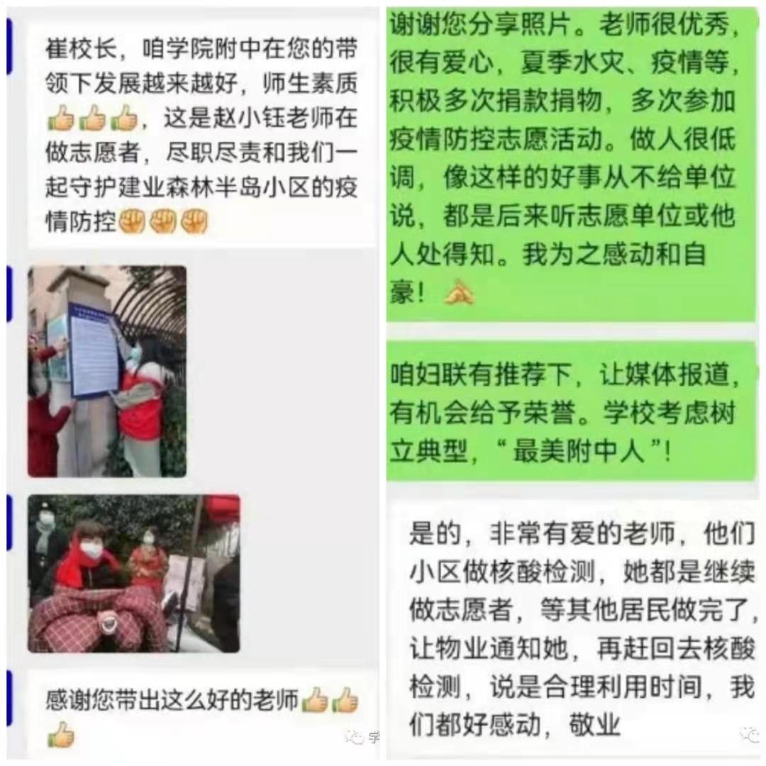 赵小钰老师在学校热心工作,有口皆碑,疫情防控志愿活动中也不例外。招募志愿者的号令刚出,她就第一时间报名,毫不犹豫。在小区门口,她认真负责,不怕苦不怕累,扫码、测温、登记、消杀、物资搬运、海报张贴……每件事她都能做得有条不紊,态度和善,让人如沐春风,内心的焦虑也减轻了不少。赵小钰老师一丝不苟的志愿服务工作被一起志愿服务的东城区妇联领导看在眼里,她们忍不住给崔俊平校长发信息,赞扬学校培养了如此优秀的教师。在疫情阻击的战场上,赵小钰老师堪称优秀的战士,向党提交了一份合格的答卷!