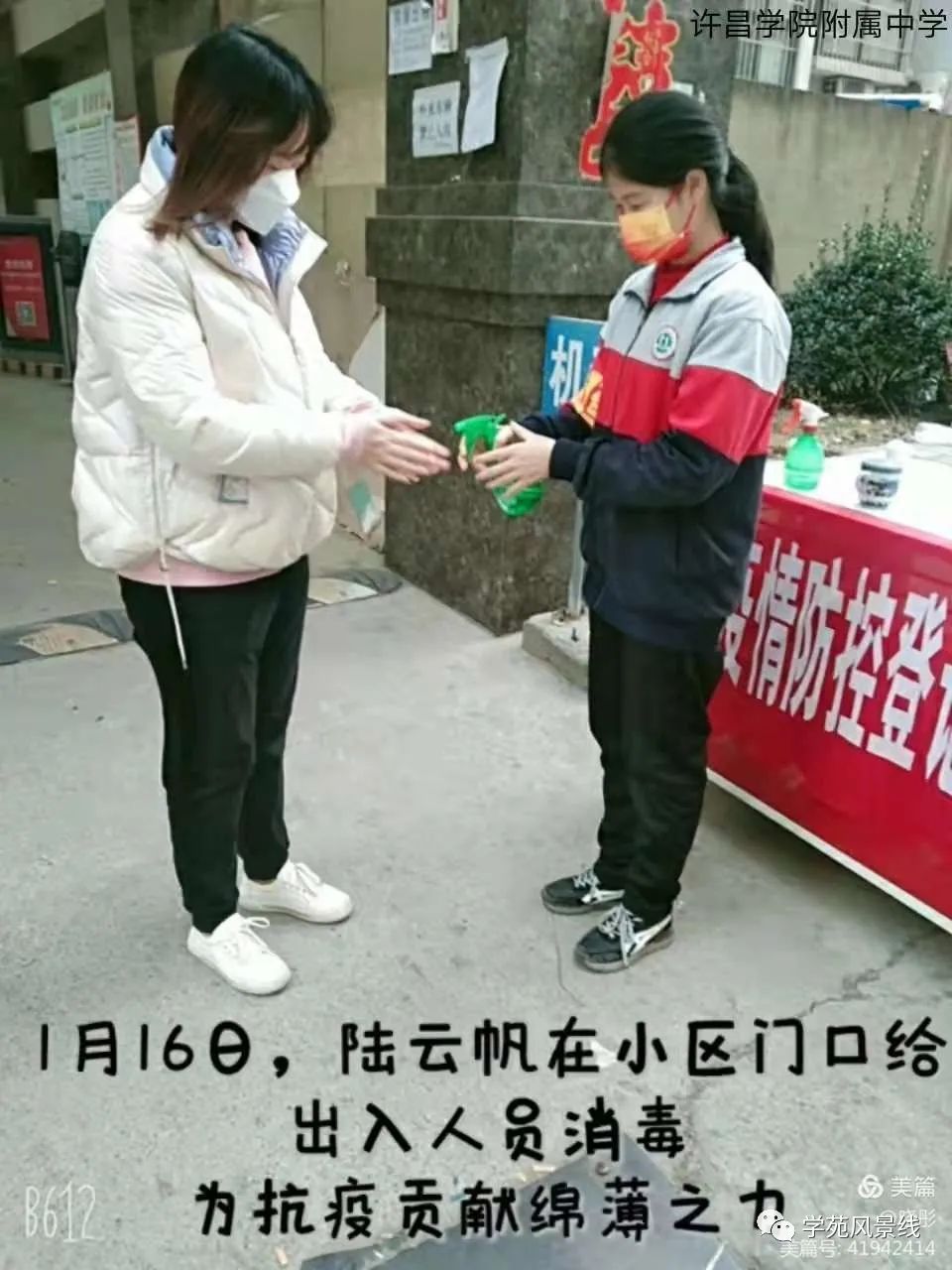 七九班徐子茉妈妈是建安区一高派驻陈曹乡袁庄村的第一书记,她带领村“两委”干部和党员同志,封堵路口,对返乡人员居家隔离劝导,每日进行消杀,排班布岗,安排部署村里核酸检测工作,为袁庄村的家人安全和健康保驾护航。