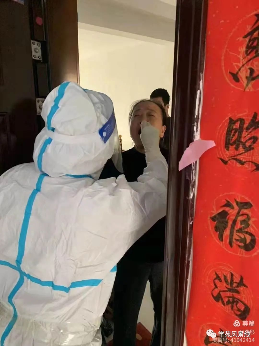 七七班寇紫的姑姑寇阿芳是建安区新区医院的工作人员,疫情期间每天都到社区进行核酸检测工作。