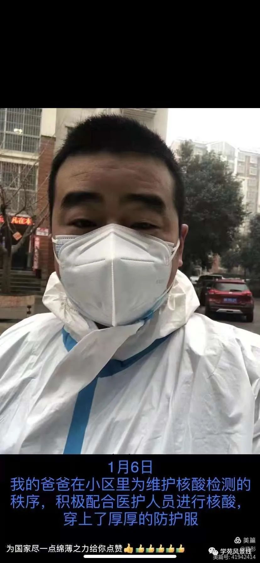 八六班高钰奇家长穿上厚厚的防护服维持小区居民核酸检测秩序。
