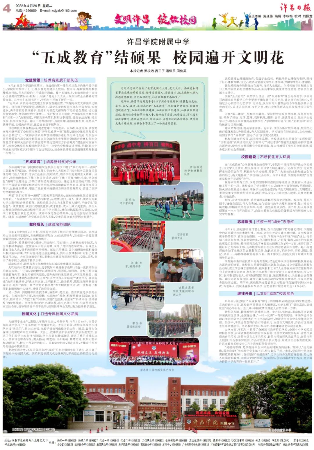 “成绩的取得,是学院附中全体师生共同努力的结果。‘附中人’因此骄傲,因此自豪!”学院附中党支部书记、校长崔俊平说,“未来,学院附中将全面贯彻党的教育方针,继续坚持‘五成教育’,为学生终身发展打好基础,努力办人民满意的教育,同时以文明‘绘就’校园底色,争创河南省文明校园,努力成为许昌中学教育的一张新名片。”