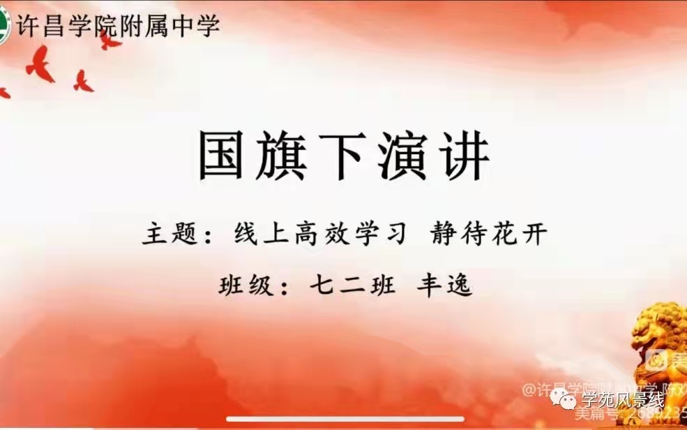 七年级二班丰逸同学进行了国旗下的演讲。丰逸同学为我们讲述了他居家期间克服各种困难,坚持高效学习的方法,在这一特殊时期,我们要懂得抓住网课学习的机遇,充实自己,是时代赋予我们的使命。正如习近平总书记在庆祝中国共青团成立一百周年大会上所说:新时代的中国青年生逢其时,重任在肩,施展才干的舞台无比广阔,实现梦想的前景无比光明。