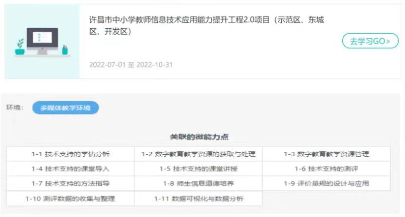 培训二:教师信息技术应用能力提升工程2.0项目培训。本次信息技术能力提升工程更加注重个性化培训,教师从11个微能力认证节点中根据自身情况选择两个完成相关任务。强调教师的深度参与,既有理论学习,还有实践运用。注重教师个人学习与整校推进相结合,发挥团队协同作用。