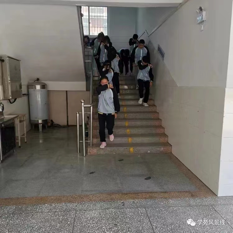 警报响起后学生沿指定路线低头弯腰捂口鼻迅速下楼