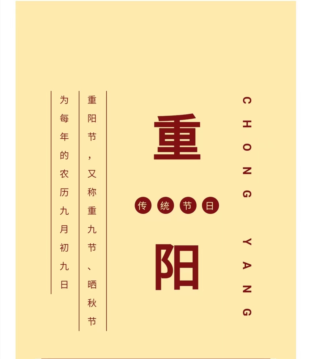 重阳节,是中国民间传统节日,节期在每年农历九月初九日。“九”数在《易经》中为阳数,“九九”两阳数相重,故曰“重阳”;因日与月皆逢九,故又称为“重九”。九九归真,一元肇始,古人认为九九重阳是吉祥的日子。古时民间在重阳节有登高祈福、拜神祭祖及饮宴祈寿等习俗。传承至今,又添加了敬老等内涵。登高赏秋与感恩敬老是当今重阳节日活动的两大重要主题。