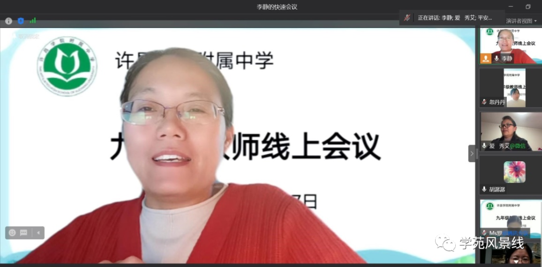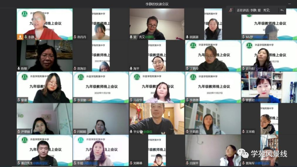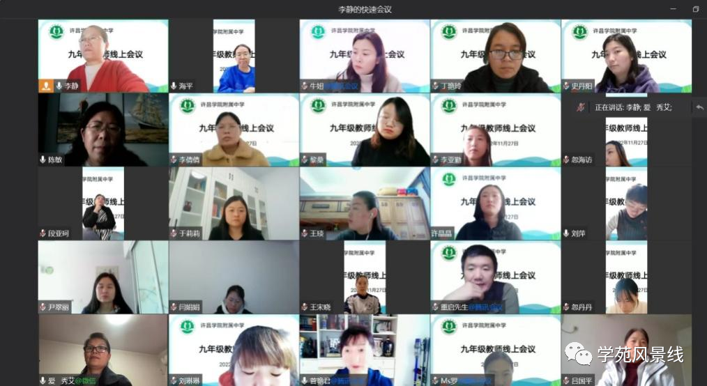 为进一步加强线上教学质量,优化教学管理,为减负增效、提质增能寻良策,11月27日下午,许昌学院附属中学九年级召开了全体教师线上经验交流会。会议由年级主任李静主持,校长崔俊平、副校长陈敏、海平及九年级全体教师参加了此次交流会。