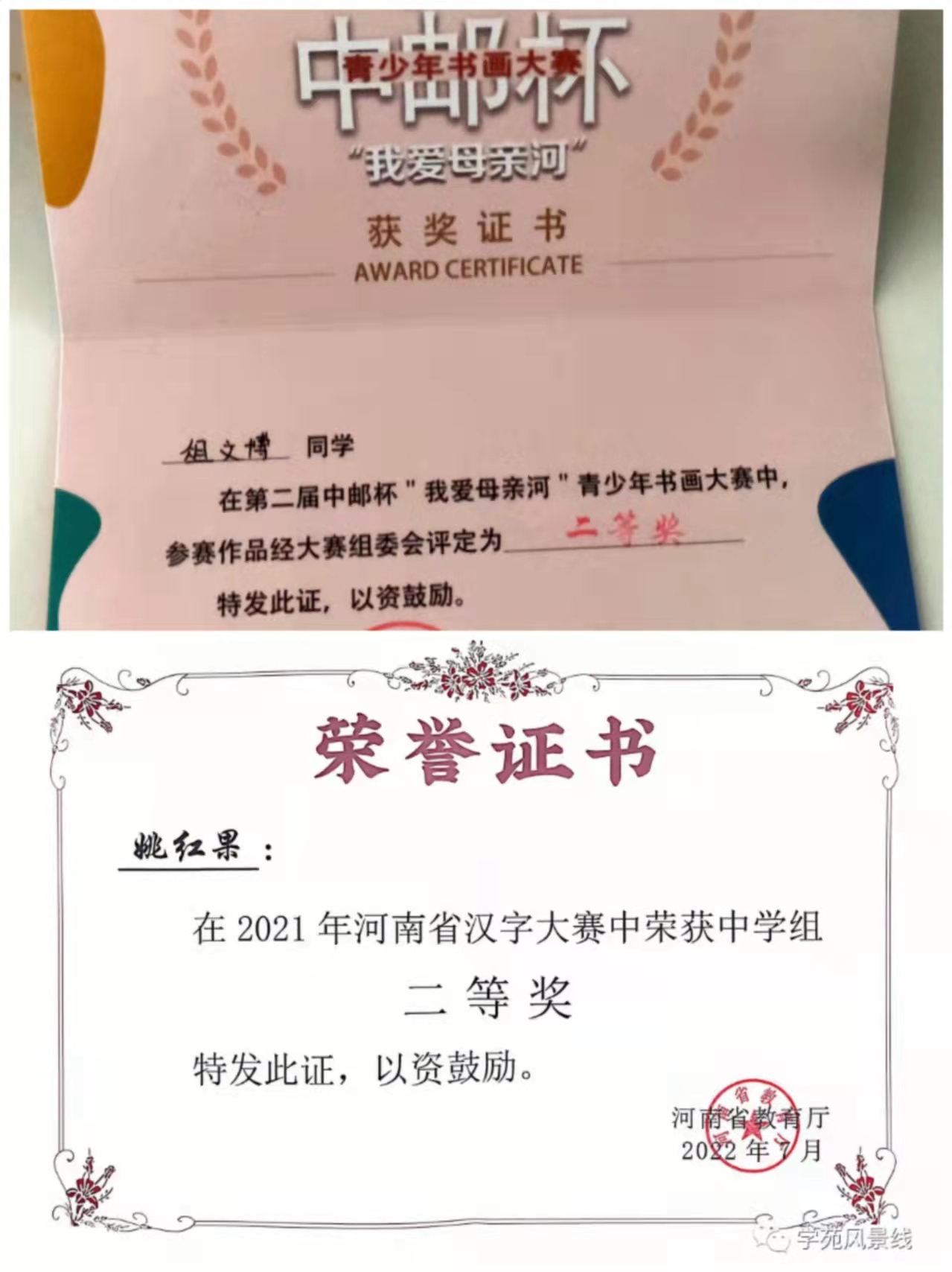 2022年3月,许昌学院附属中学九二班学生俎文博参加河南省第二届中邮杯“我爱母亲河”青少年书画大赛并荣获二等奖。