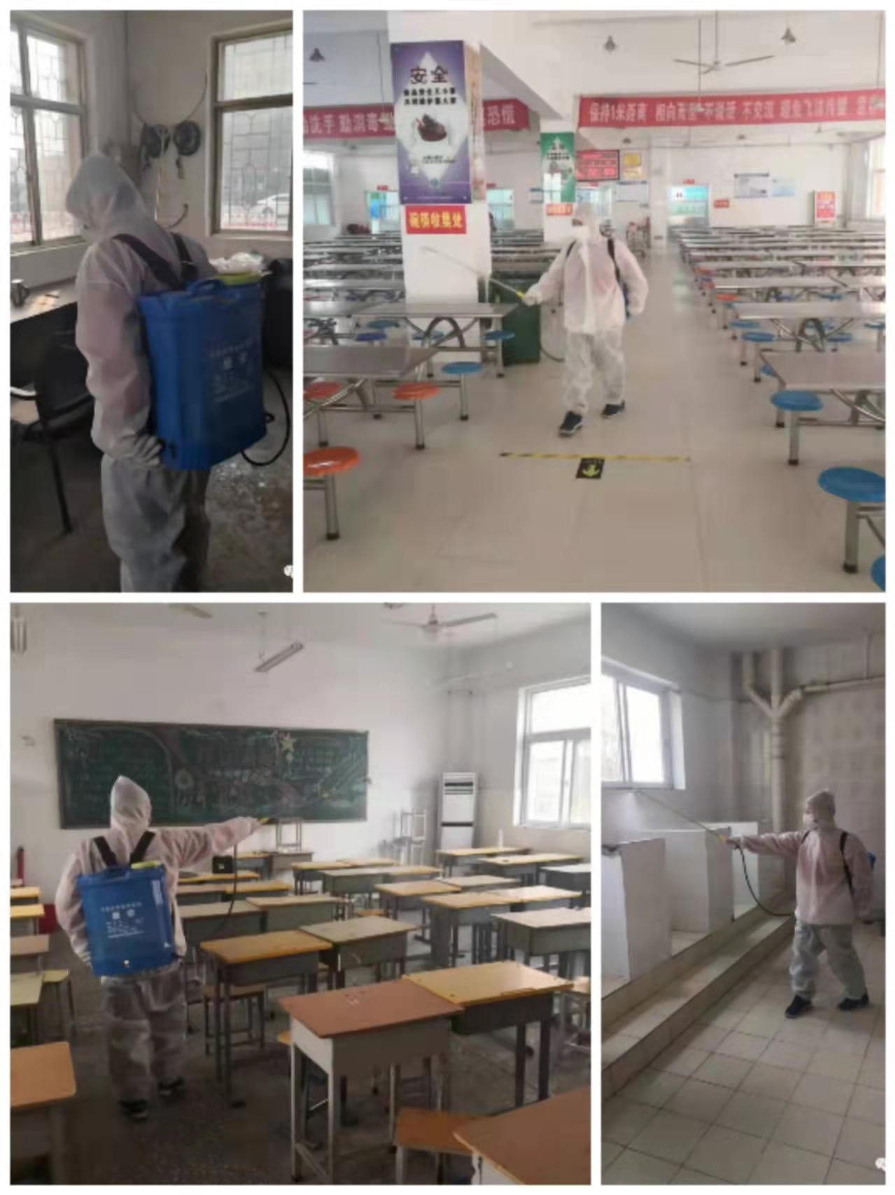 后勤工作人员对教学楼、办公室、餐厅等进行全面消杀。