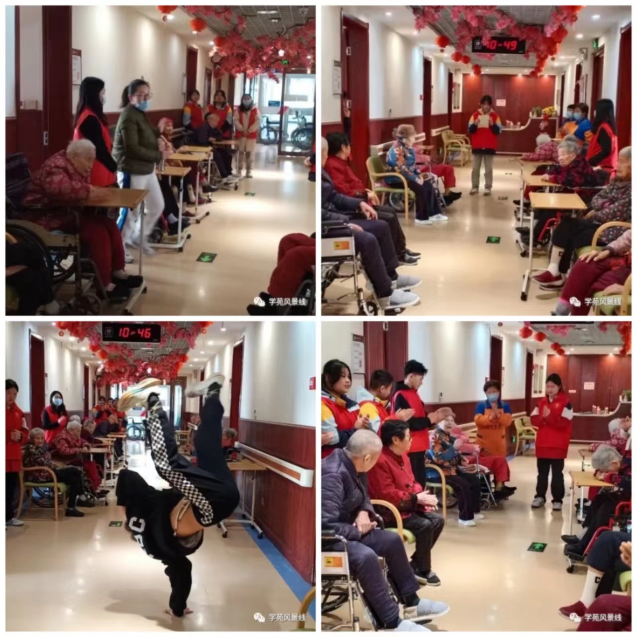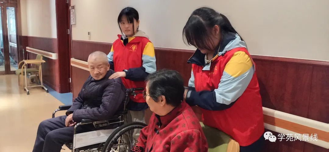 随后,在失能区,志愿者们与老人拉家常、为老人梳头发、捶背、帮助打扫卫生等,五位同学还分别为老人带来了精心准备的才艺,唱歌、跳舞,各显其能,老人们也沉浸其中,以一首《朝阳沟》选段回馈同学们的精彩演绎。活动现场其乐融融,原本安静的楼道一下子热闹了起来,老人们脸上露出了幸福的笑容。