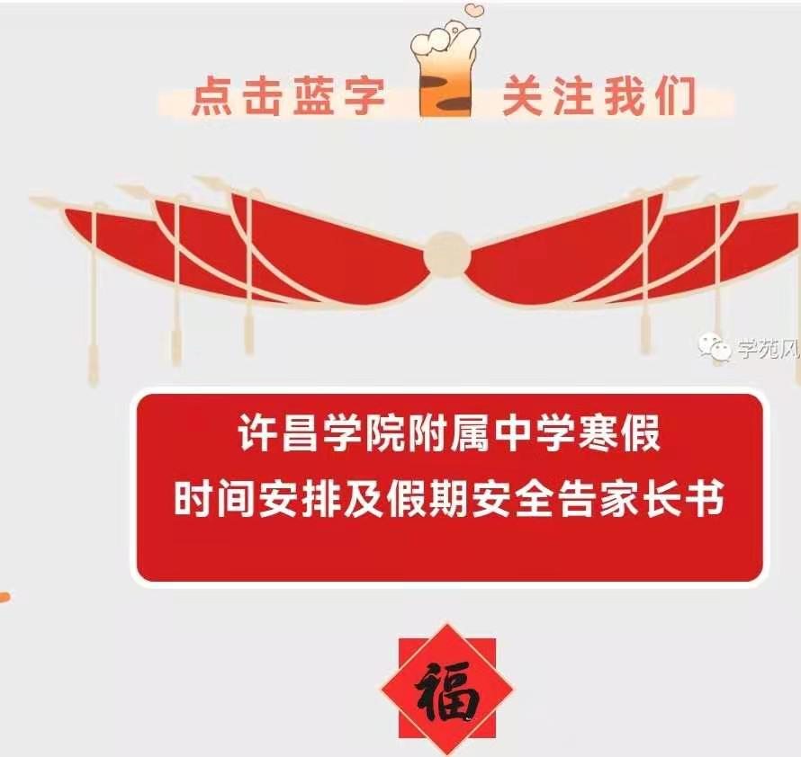 2022年寒假及春节假期将至,在新年的钟声即将敲响之际许昌学院附属中学衷心祝愿家长朋友们新年快乐、阖家幸福。为了共同做好孩子假期安全教育,让每一个孩子度过一个“安全、健康、快乐、充实”的假期,特致2022年寒假安排及春节假期安全注意事项告知如下: