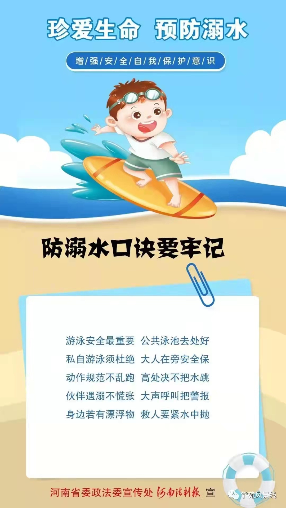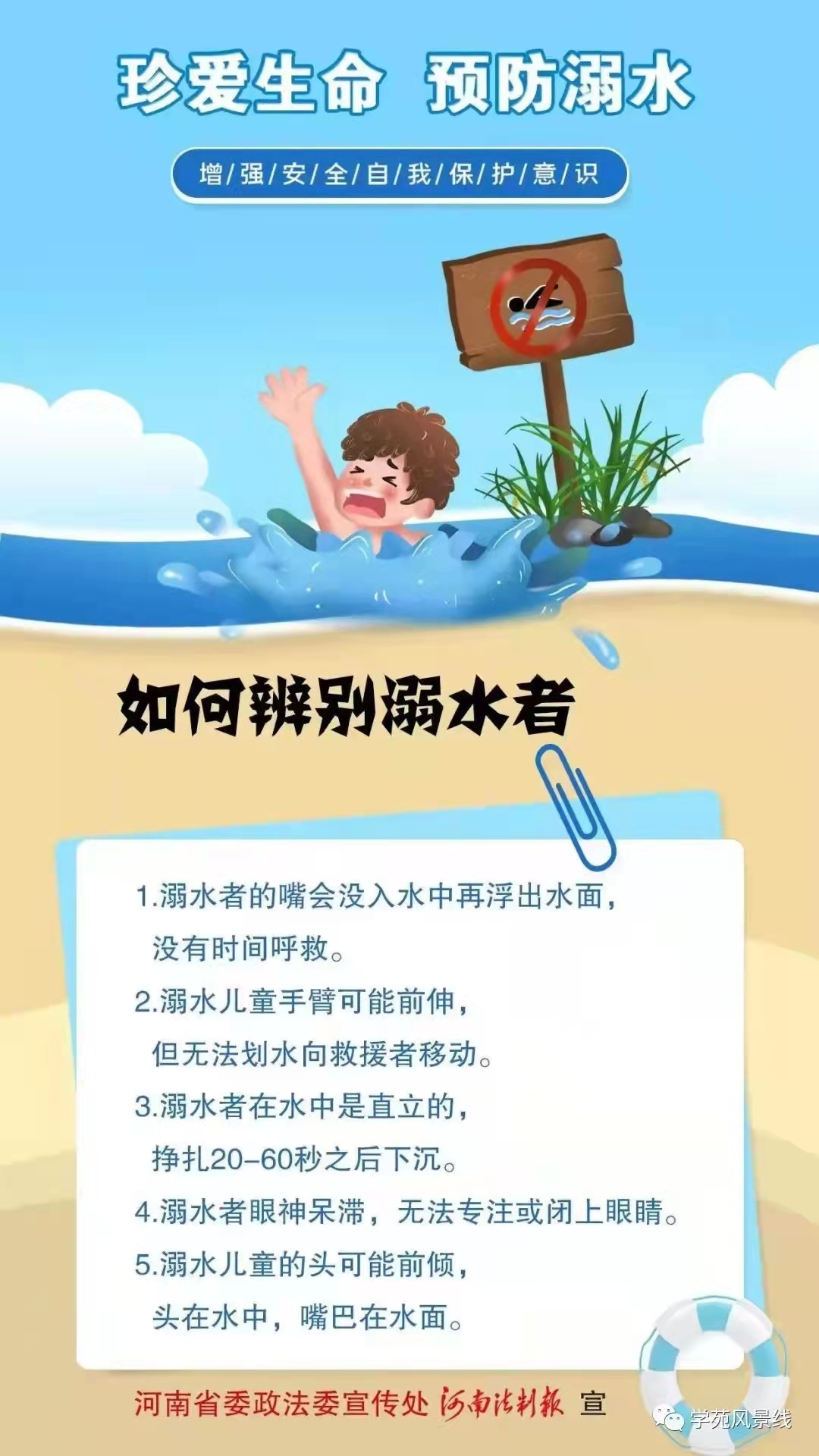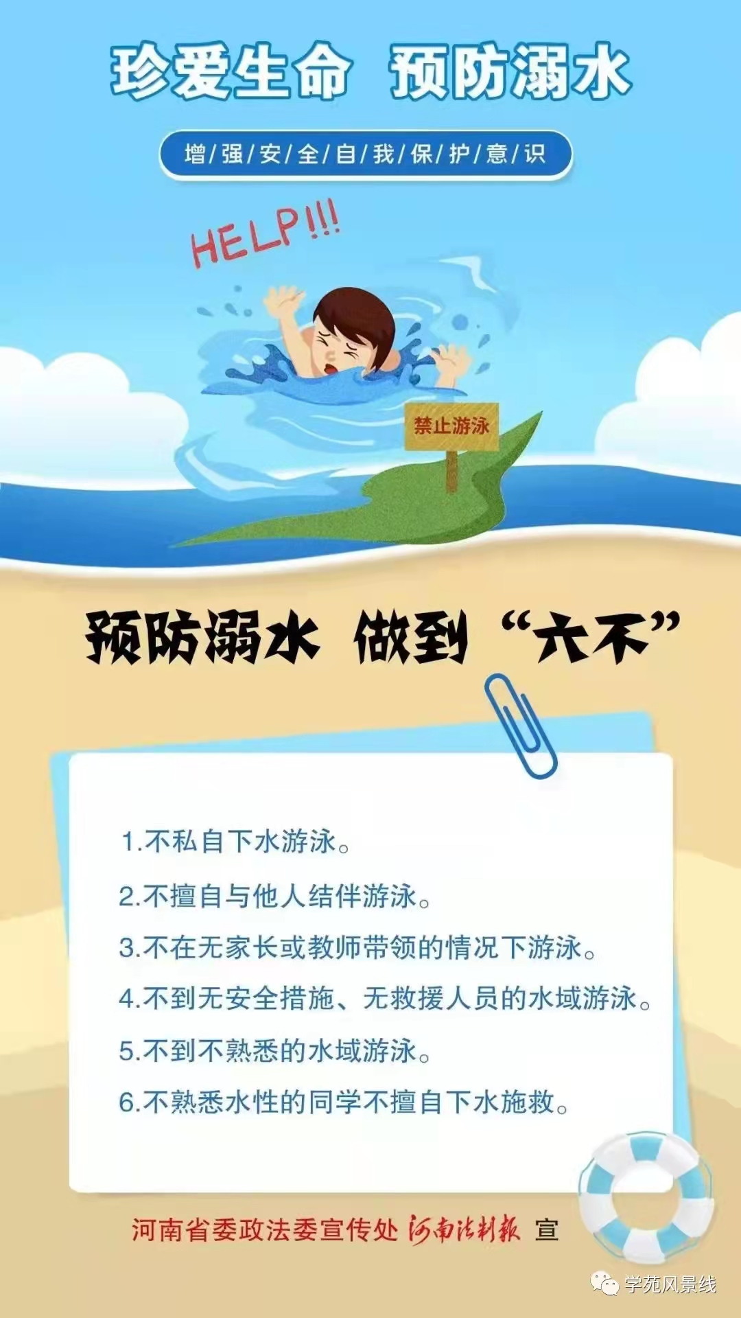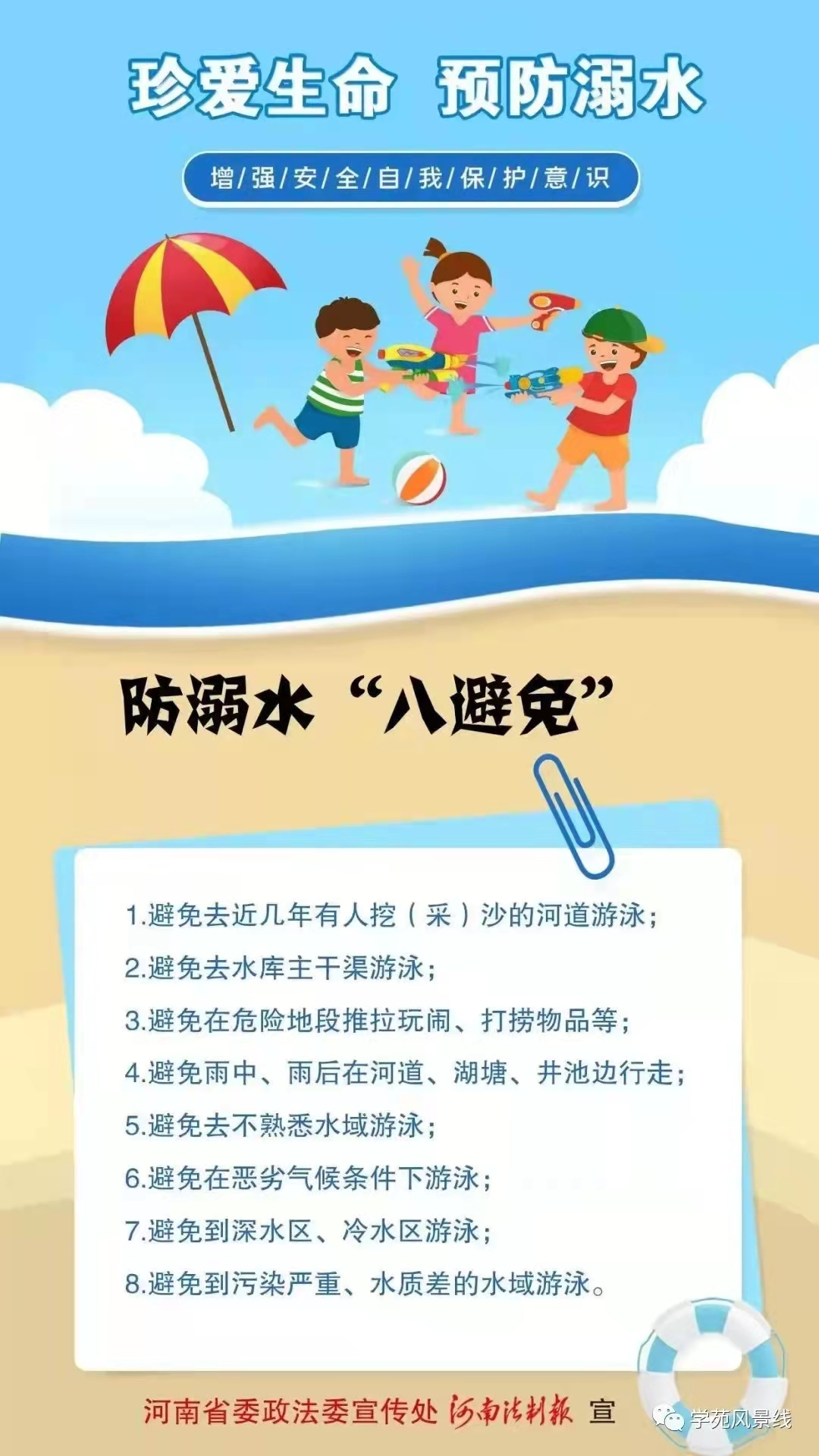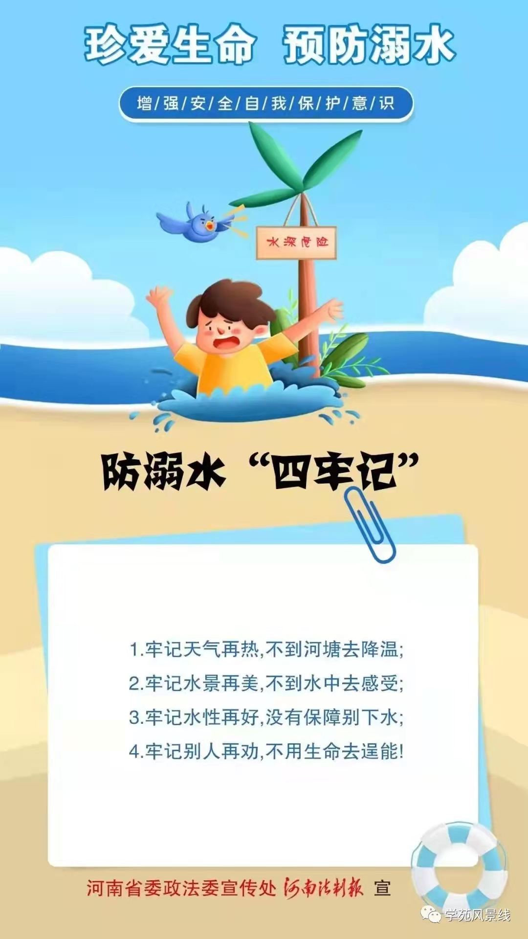 您好!当前天气炎热,已进入溺水事故易发期、高发期,为积极构建平安校园,避免悲剧的发生,在此,我们希望广大家长务必增强安全意识,自觉担起监护职责,与学校一起,加强对孩子的教育和管理,共同做好孩子的防溺水工作。