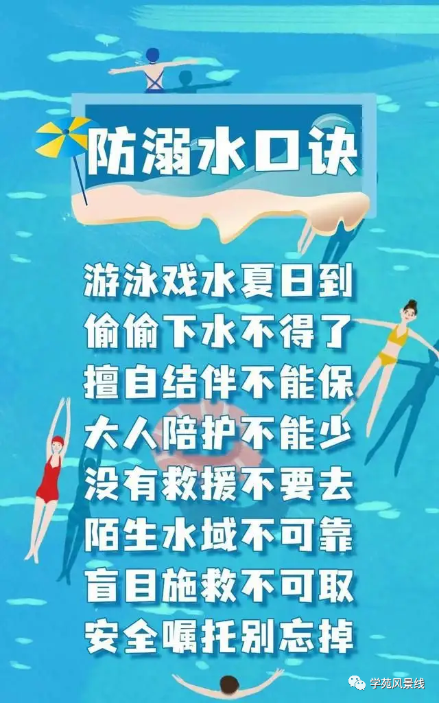 随着暑假来临,溺水又将进入高发季,希望广大家长务必增强安全意识和监护意识,切实承担起监护责任,加强对孩子的教育和管理,特别是加强孩子结伴外出游玩的管理,经常进行预防溺水等安全教育,给孩子传授相关知识和技能,不断加强孩子安全意识和自我保护意识,提高孩子们的避险防灾和自救能力,严防意外事故的发生。