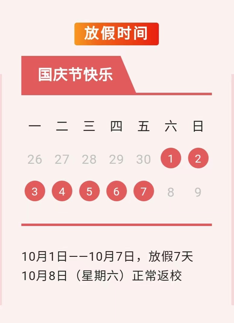金秋十月迎国庆,璀璨喜气耀大地。同庆祖国73岁华诞,喜迎党的二十大召开。在国庆假期即将来临之时,为了让大家过一个平安祥和、愉快充实的假期,我校根据上级文件精神,结合当前疫情防控要求及我校实际,现将2022年国庆节放假安排及有关事项告知如下: