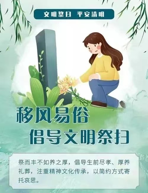 清明节上坟祭扫,做到不烧香、不烧纸、不点蜡烛、不燃放烟花鞭炮等,做到文明祭祖。