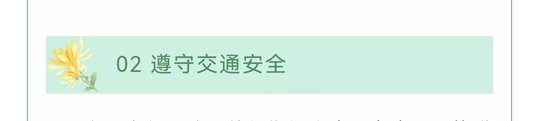 文明出行:清明放假期间人多、车多,严格遵守交通法规,过马路注意来往车辆,行人靠右,走人行道,做到走文明路,做文明人。遵守公共秩序,乘坐公交车做到排队候车,车未停稳不得靠近车辆,上下车时不拥挤;乘坐机动车辆时要系好安全带。骑乘摩托车、电动车戴好头盔,不乘坐无牌照、无保险的车辆。