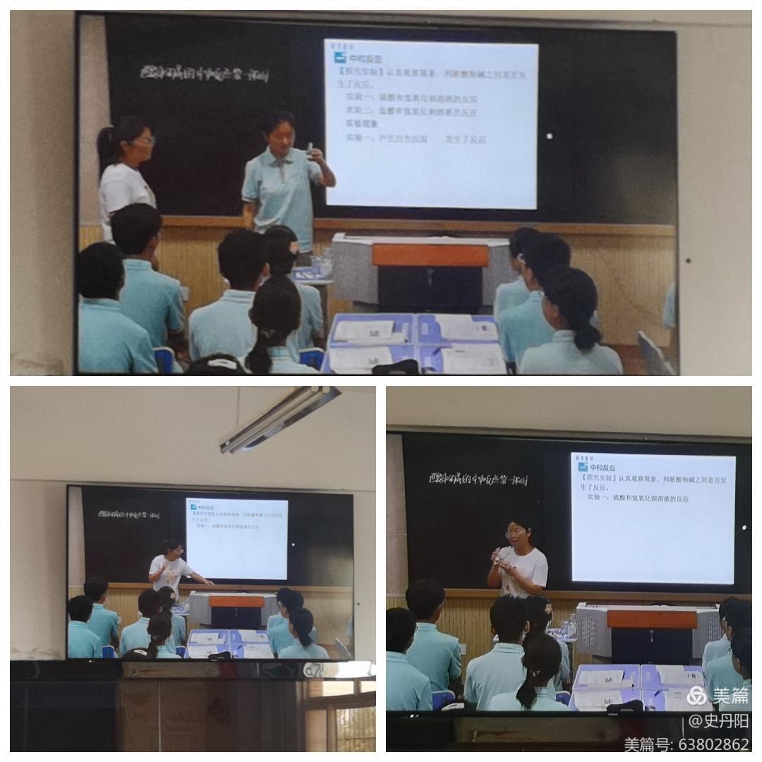 第二节授课的是将官池中学的贾燕冰老师,贾老师讲的是酸和碱的中和反应。通过有现象的稀硫酸和氢氧化钡的反应引入本节课。让学生知道酸与碱的反应并不是都没有明显的现象,课堂内容设置与课本联系紧密,教态自然松弛。