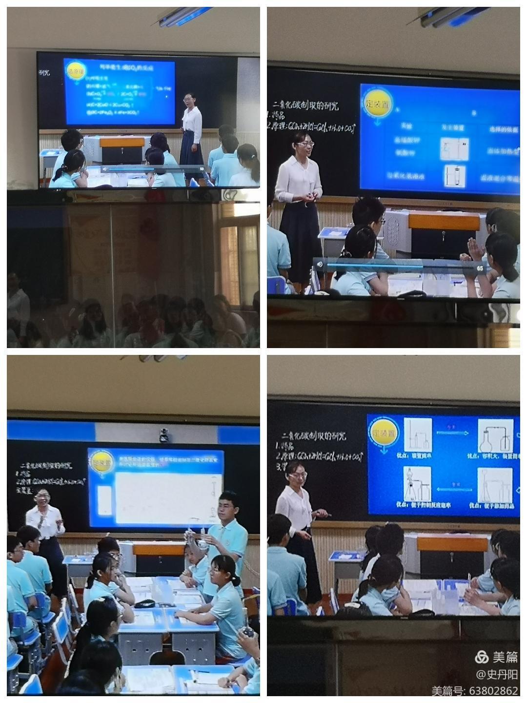 首先是许昌学院附属中学的李娜老师授课——二氧化碳制取的研究。李老师整节课的教学思路清晰,课堂内容设置严谨,有效。首先从西游记引入,提高学生的学习兴趣,通过对反应物的状态,反应条件的讲解,总结出制取的反应装置,紧接着小组合作设计制取二氧化碳的装置,并交流展示。组装仪器制取二氧化碳,并讲解其检验和验满方法。最后总结实验室制取气体的一般思路。