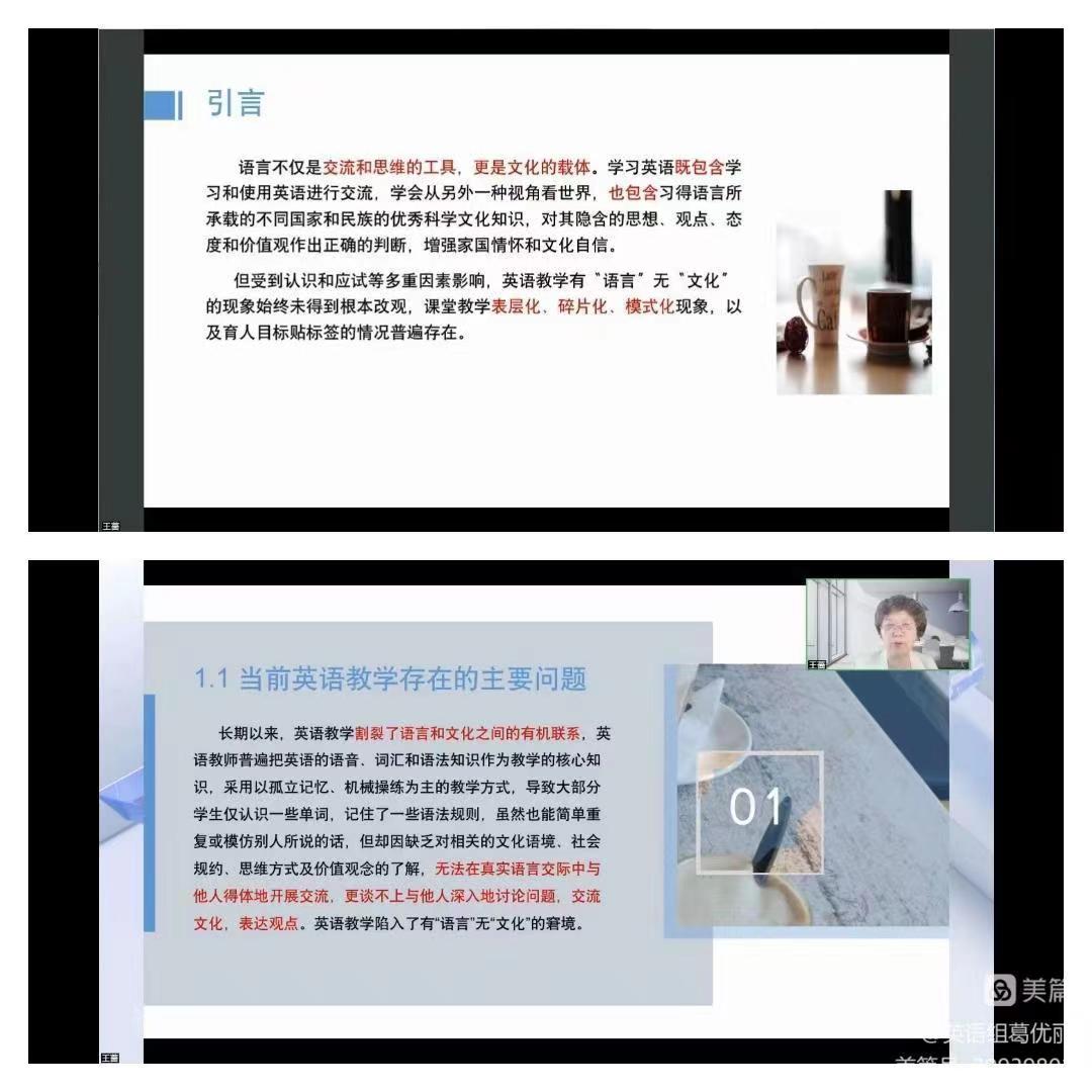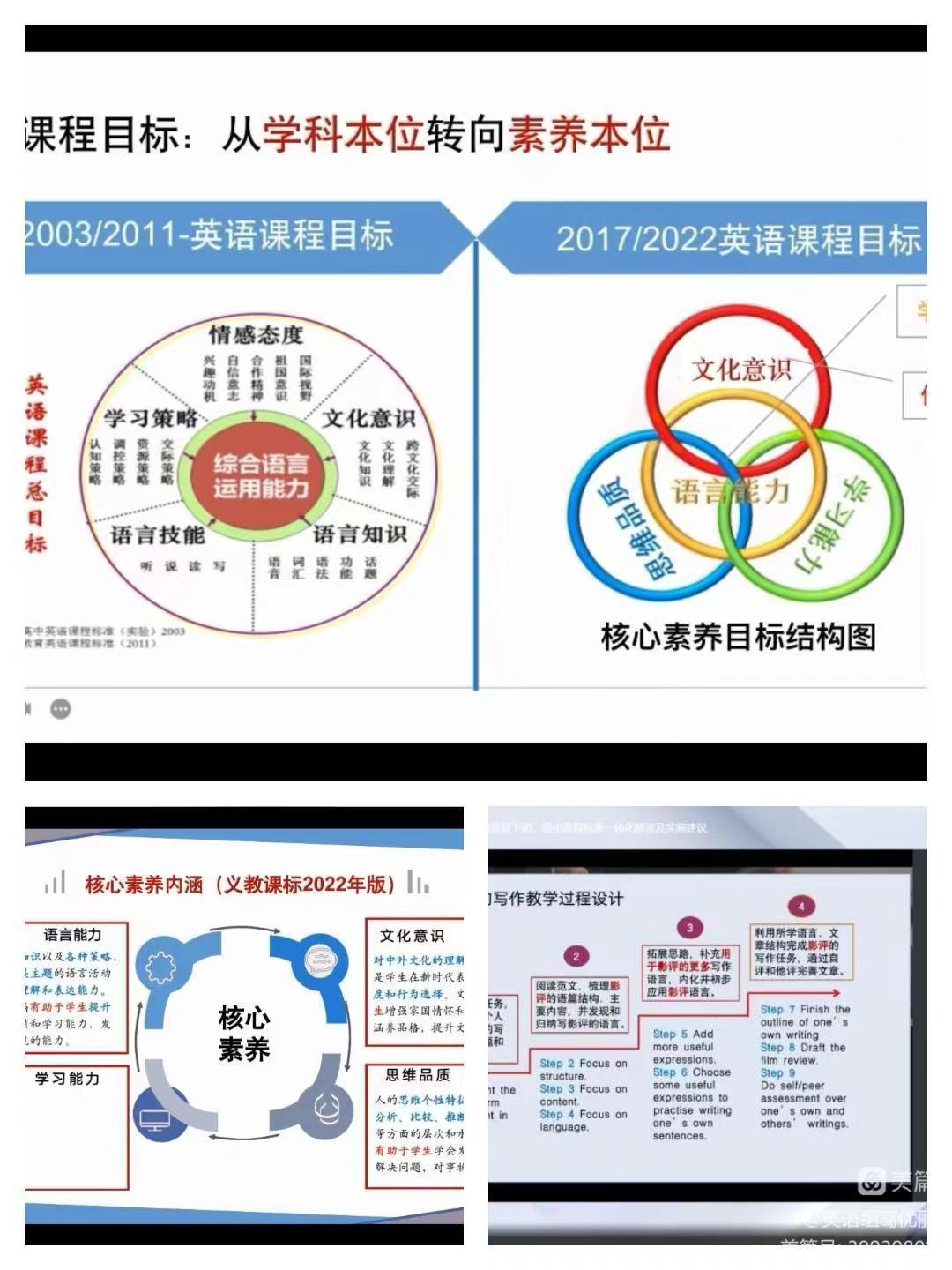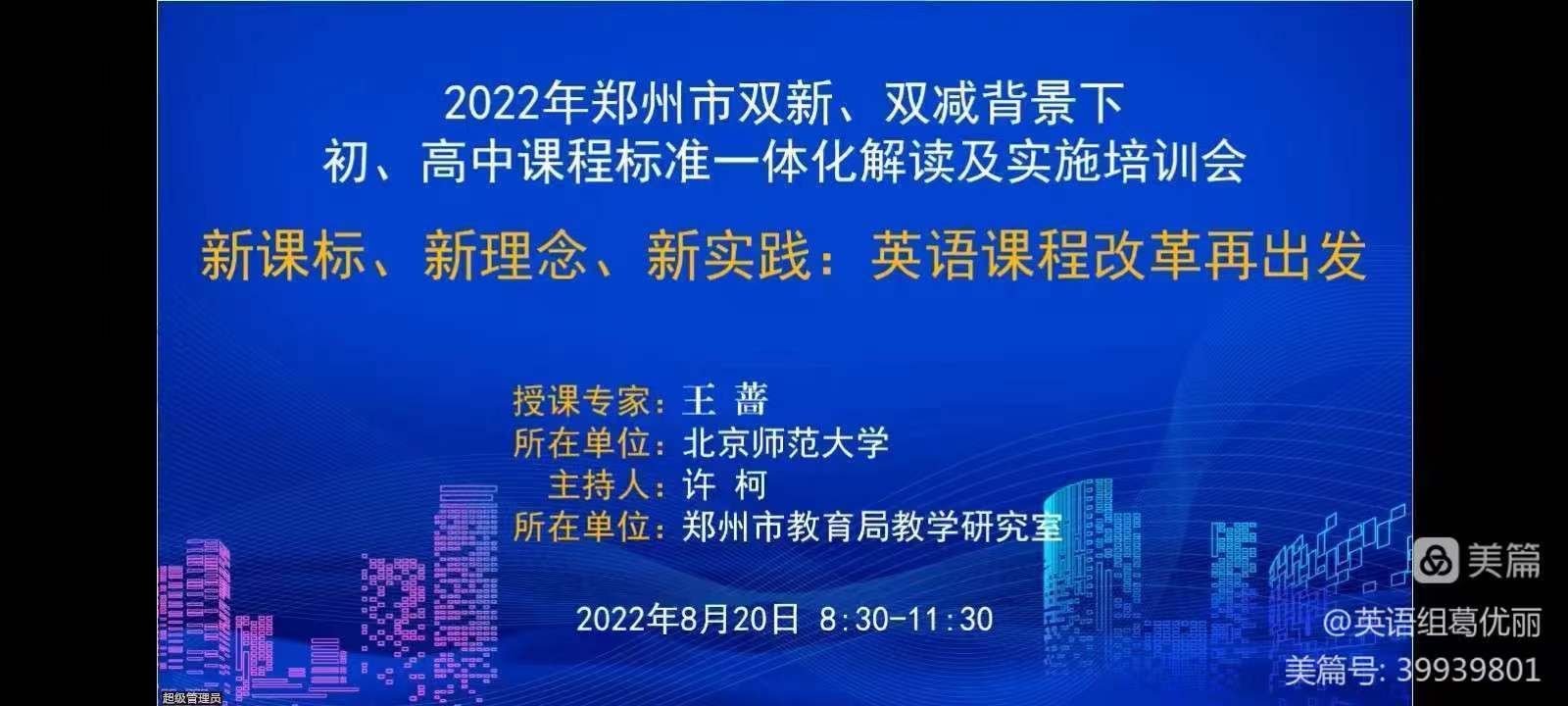 为落实立德树人根本任务,充分发挥义务教育学科课程独特的育人功能与价值,帮助我们一线教师对《课程标准》进行一体化思考,明确课程目标、课程内容、学业质量及课程实施建议方面的内在逻辑关系及进阶发展,2022年8悦20日上午我们学院附中英语组全体教师参加了郑州市“双新、双减背景下初、高中课程标准一体化解读及实施”培训活动。主讲为王蔷教授。