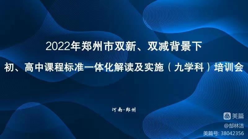 为落实立德树人根本任务,充分发挥义务教育、普通高中学科课程独特的育人功能与价值,帮助初、高中学科教师对初、高中《课程标准》进行一体化思考,明确初、高中学科课程标准在课程目标、课程内容、学业质量及课程实施建议方面的内在逻辑关系及进阶发展,从而更有效地实施新课程、新教材、新教学和新评价,做好初中高中衔接,促进学生核心素养的可持续发展,经研究决定举办郑州市“双新、双减背景下初、高中课程标准一体化解读及实施”培训活动。
