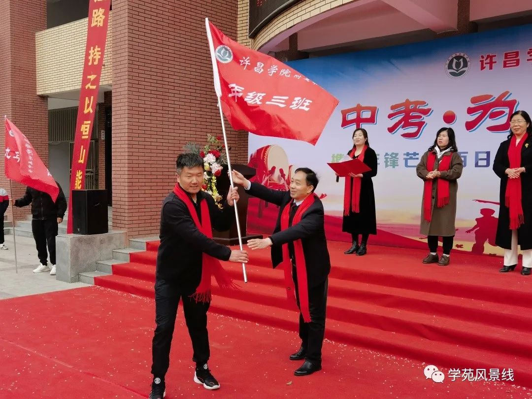 鲜衣怒马少年时,不负韶华行且知。在激昂的音乐声中,崔俊平校长挥舞旗帜为九年级班主任授旗,战旗在手中流转,传递的是学校的谆谆嘱托与殷殷期盼,接过的是一份义无反顾的使命。在各班学生代表的带领下,同学们拉起横幅,扬起班旗,用响彻云霄的声音喊出自己班级的誓言,彰显了青春蓬勃的朝气,笃定中考必胜的决心。