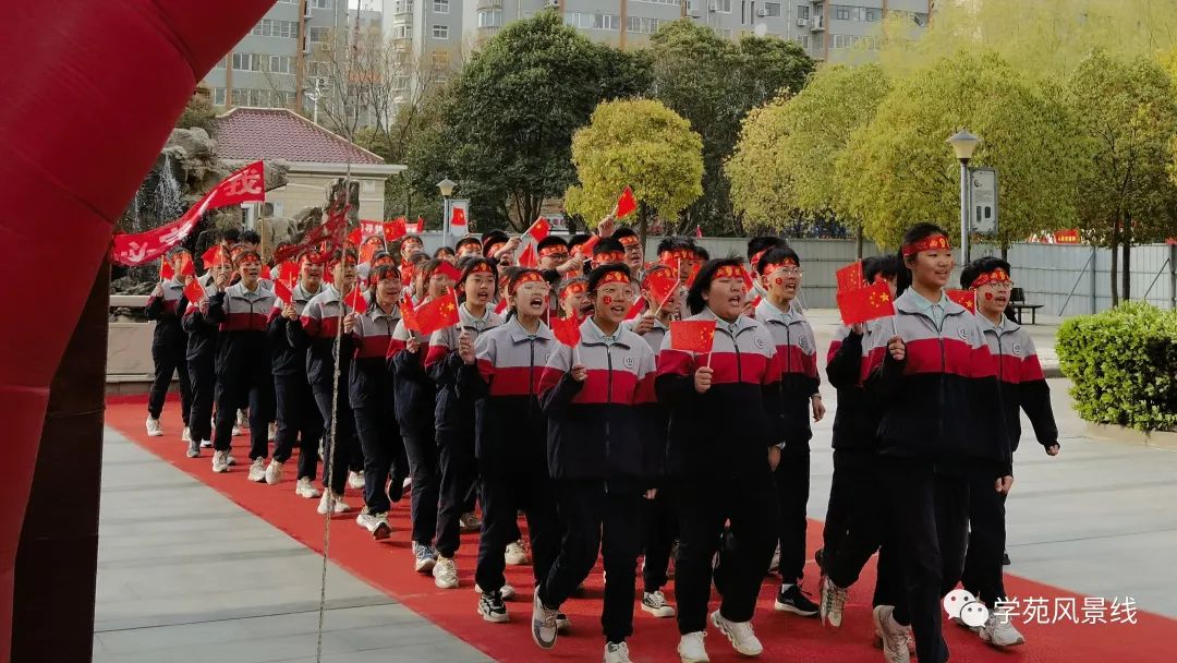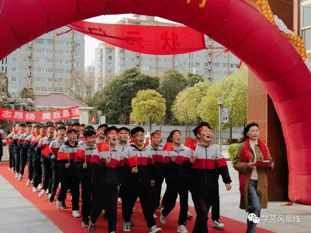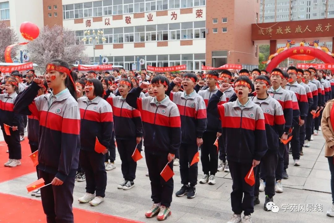 化身青鹏争霄汉,只待锦鲤跃龙门。在隆隆的战鼓声中,同学们手举红旗,拉着横幅,迈着坚定的步伐,昂首阔步走向“状元门”,校领导及初三全体教师,分列两侧与学生击掌,给予最真挚的祝福。