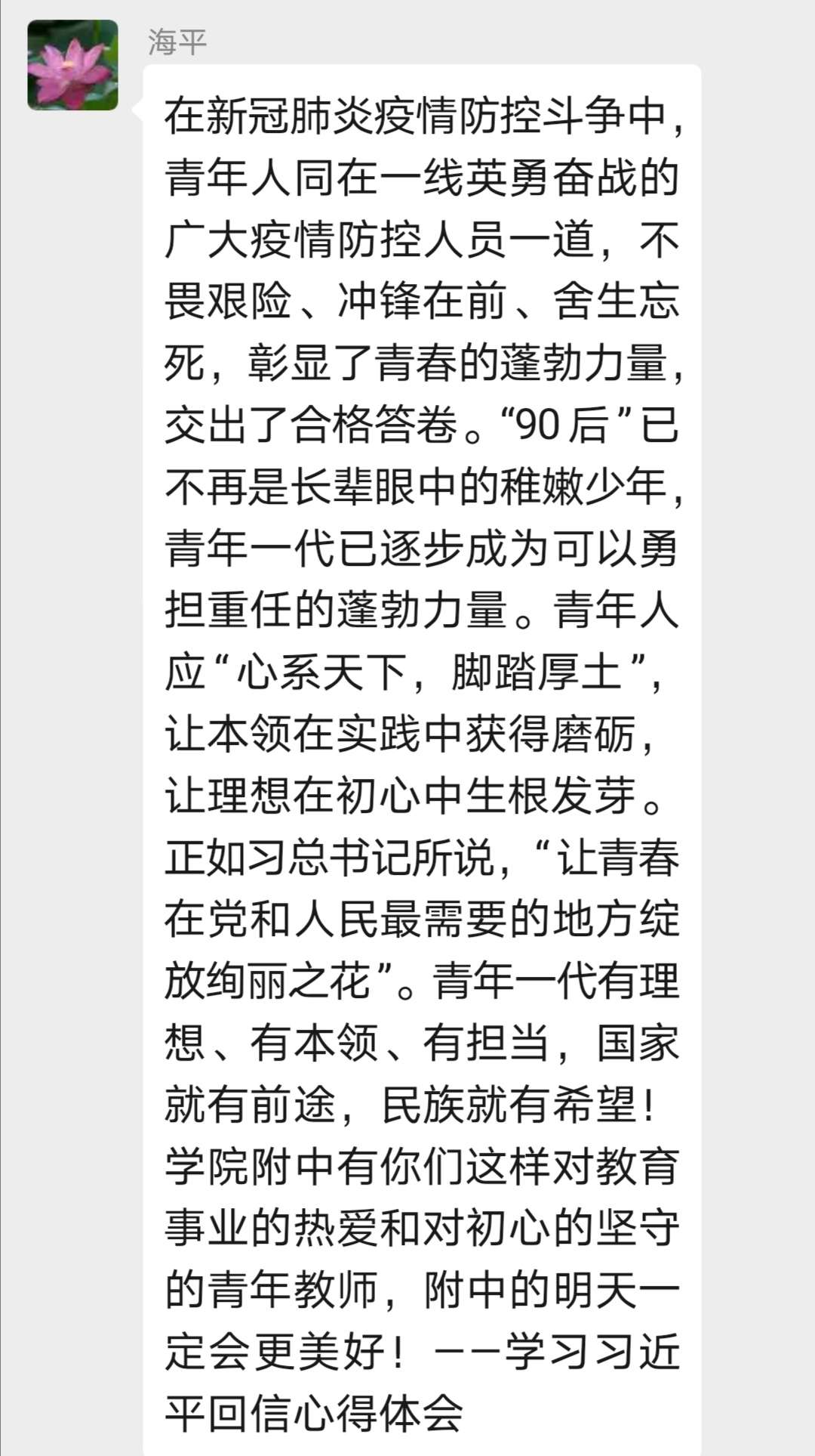 新入职教师李晓凤老师这样写道:北大青年援鄂医疗队的事迹对我们同辈人来说是一种激励。在党和国家、在人民最需要时,就是我们彰显蓬勃力量之时——当代中国青年应当挽起臂膀,挺起胸膛,向着我们共同的战场,贡献自己的智慧和力量。而作为一名普通的青年教师,我会牢记党和国家对我们青年一代的希冀和鼓励,用自己的实际行动为教育事业添砖加瓦,不断在学习和工作中磨砺自我,用过硬的本领让青春之花迎接更多的挑战、承担更多的责任。