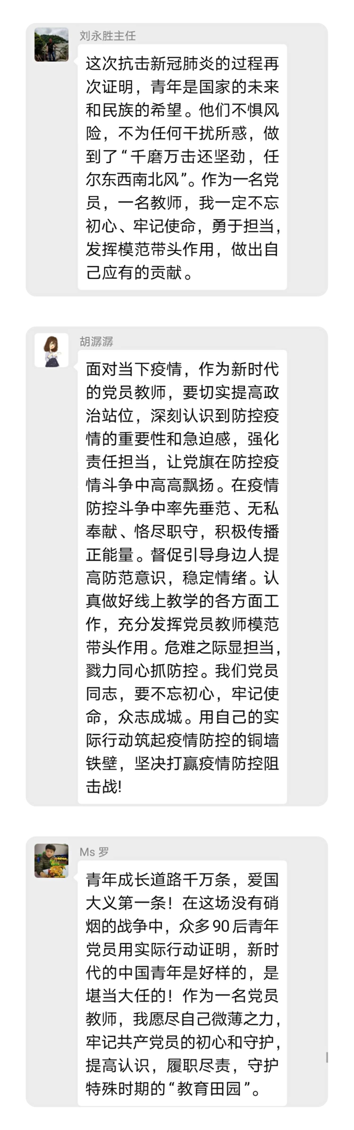 另外一位新入职教师郭康莉老师说:这场突如其来的疫情阻挡了许多人前行的脚步,却让全国人民的心紧密地联系在了一起。我们在感慨生命无常的同时,也看到了生命之花开得更加绚烂。曾经不谙世事的“90”后,如今已成为奋战在抗疫一线的白衣天使。护目镜和口罩遮住了他们的脸庞,却遮不住他们的笑脸和乐观;宽大的防护衣将他们厚厚地包裹,却愈显他们身影之伟岸。曾经备受争议的“90”后,已用他们顽强拼搏的精神和百折不挠的意志在这场没有硝烟的战争中彰显了奉献的难能可贵和生命的伟大崇高!