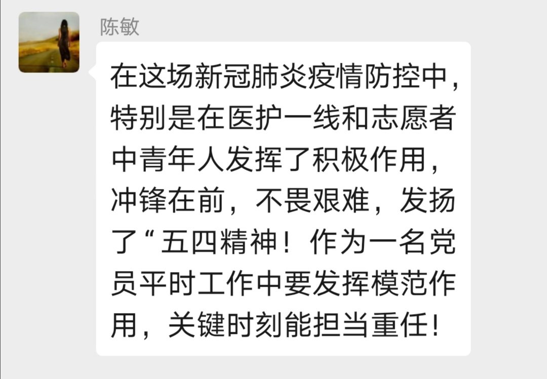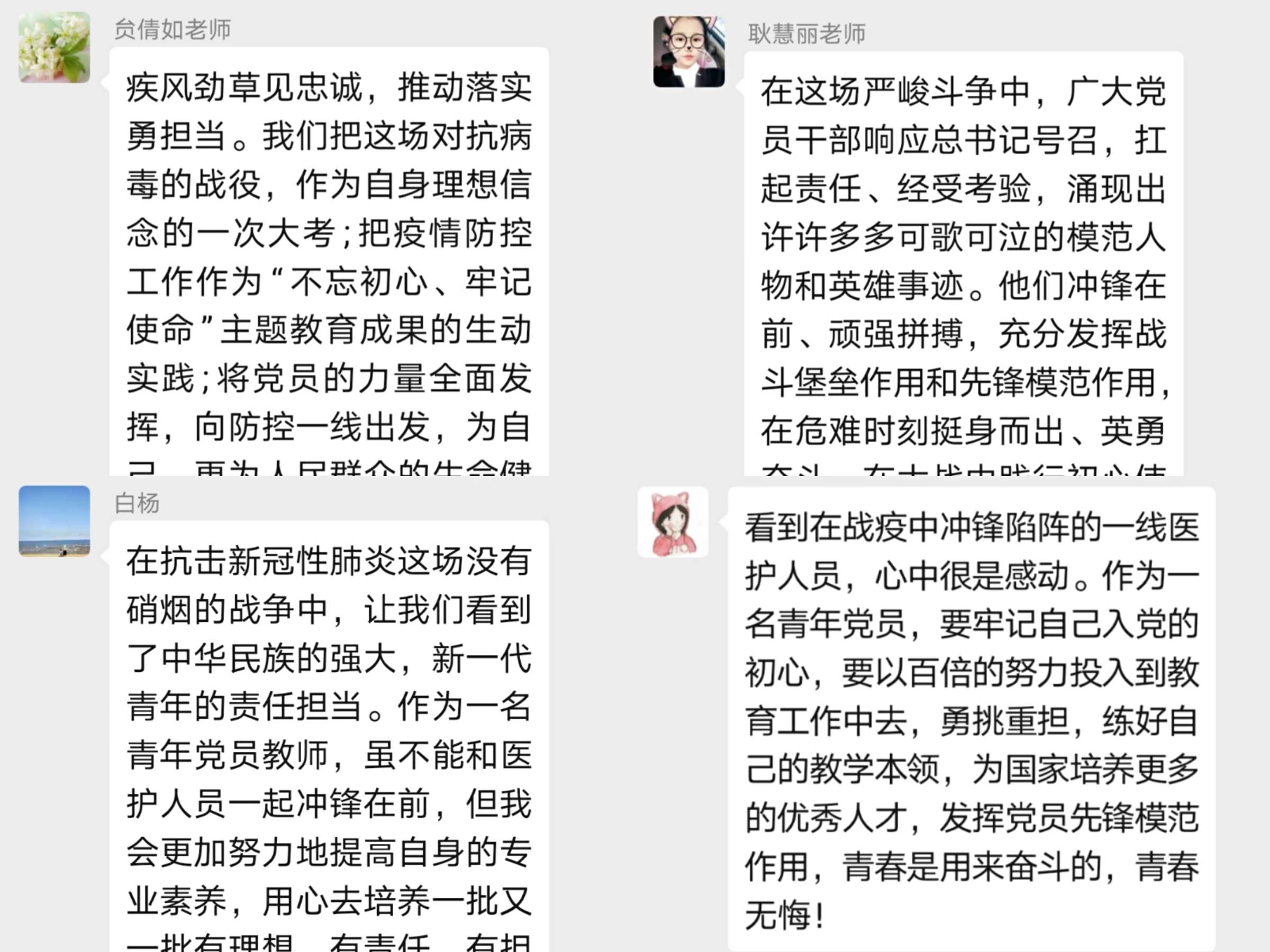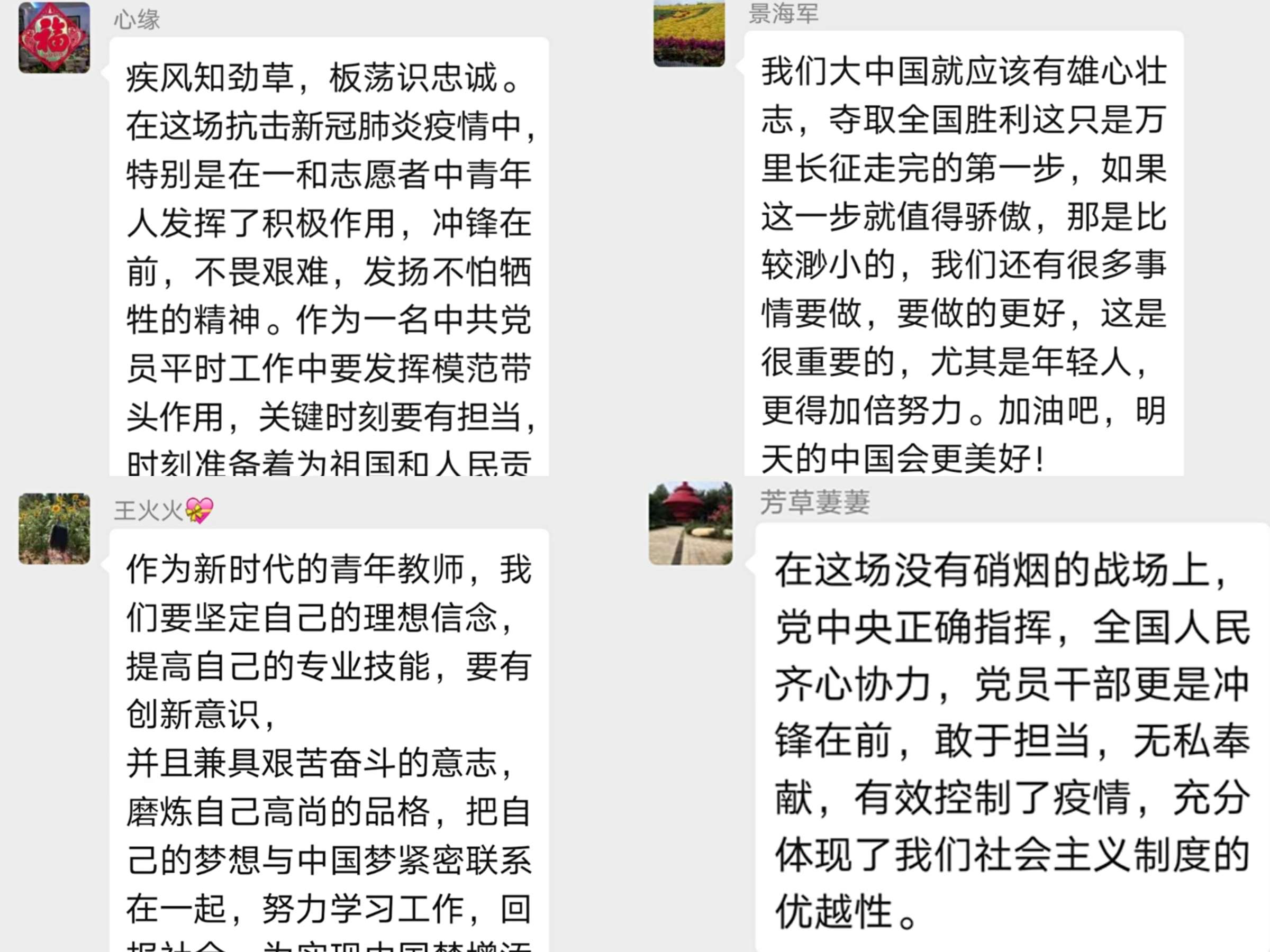 作为一名青年党员,我非常感激党和国家的培养。正是因为有他们的坚强后盾,我才能够在和平的环境中成长、成才,实现自己的理想抱负。当党和国家有需要的时候,我一定会毫不犹豫地奉献自己,实现自己的人生价值。很遗憾我不是一名医护人员,不能在抗疫一线冲锋陷阵,和病毒作斗争。但我也很幸运自己能够成为一名伟大的教师,有幸做祖国的花朵人生道路上的领路人。作为青年教师的我们,不仅要向学生传授科学文化知识,更要培养他们的爱国主义思想和悲天悯人的情怀。让学生不只是“一心只读圣贤书”,更要“家事国事天下事事事关心”,产生油然而生的民族自豪感和自信心。祖国的未来离不开青年一代的奋斗和奉献。无论身处哪个行业,我们都会用实际行动为伟大祖国的复兴添砖加瓦!