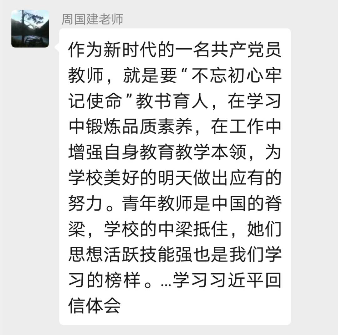 短短数百字的回信,寄托了习近平主席对青年人的无限期望!老师们读得深入,学得深刻。放眼未来,正如崔俊平校长的寄语:心中有爱,春暖花盛开;眼中有光,脚下有力量!让我们:眼中有光、心中有爱、手中有尺、行中有慧,不恋过往,不畏将来,永跟我党,共筑梦想,携手奋进神往的诗和远方!